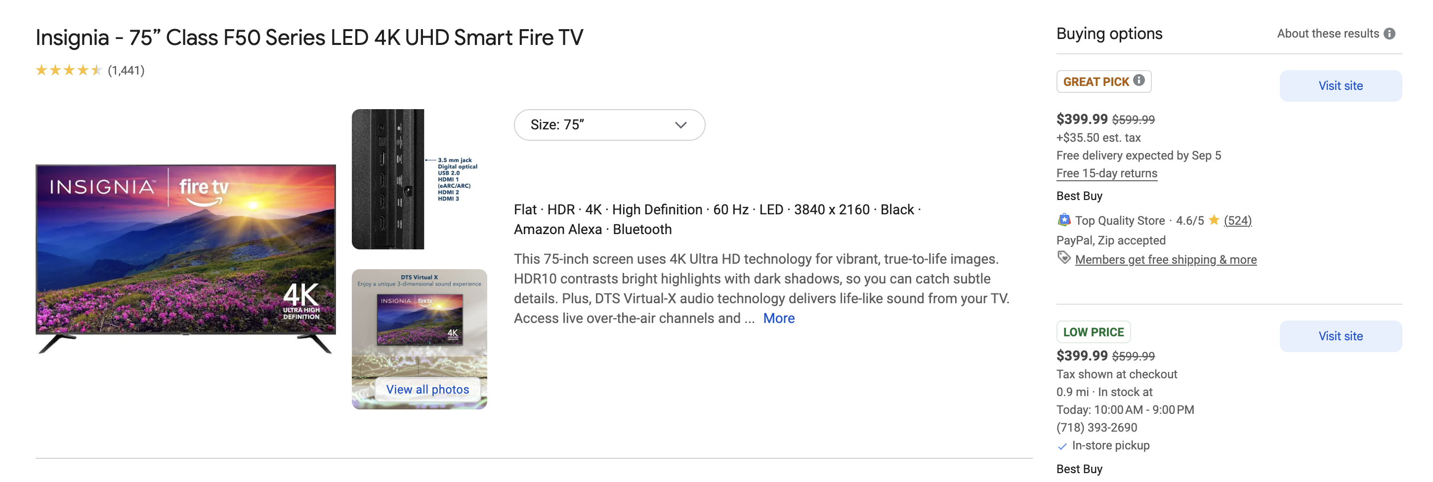 AV | 1 | Living Room | Flat screen TV, 75 inches | $599.99 | 0:22 | Best Buy | ![]() |