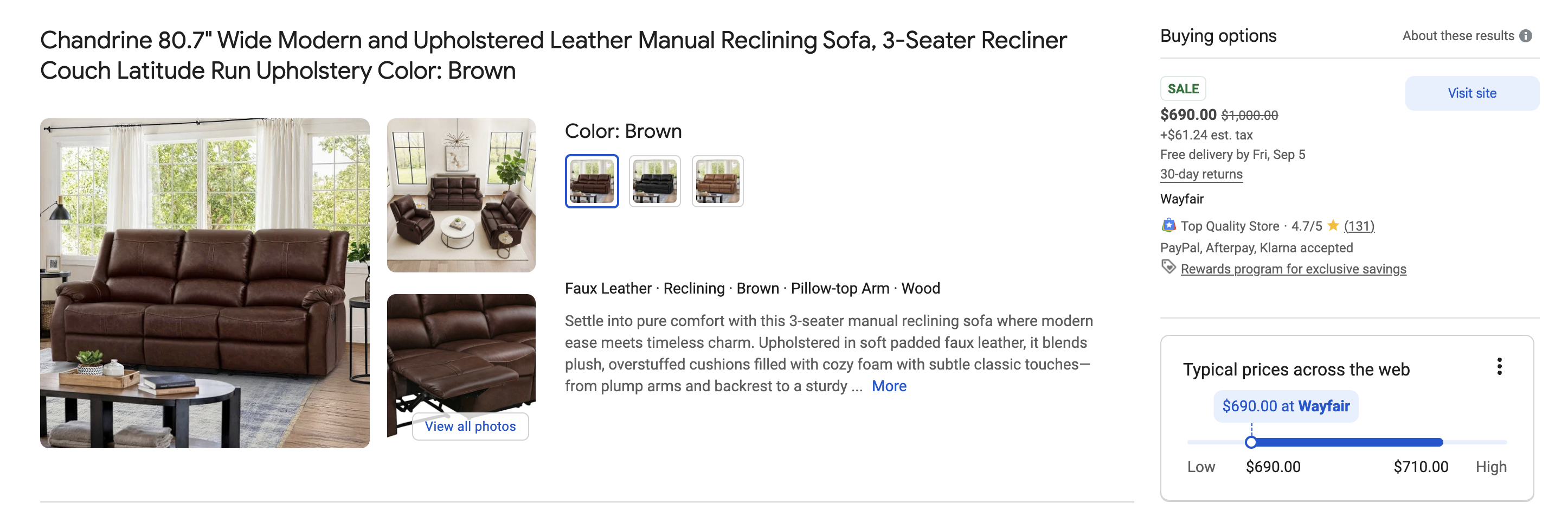 SF | 1 | Living Room | Reclining three cushion leather couch | $1,000.00 | 0:02 | Wayfair | ![]() |