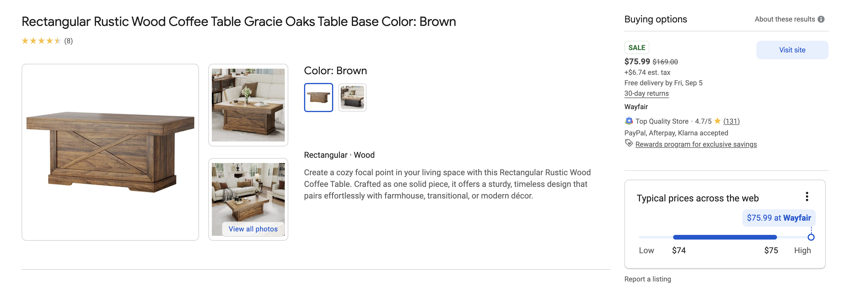HF | 1 | Living Room | Wooden coffee table, 4 ft x 2 ft | $169.00 | 0:07 | Wayfair | ![]() |