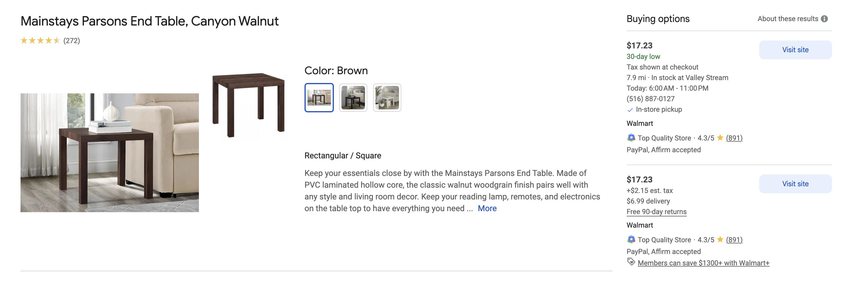 HF | 2 | Living Room | Wooden end table, 2 ft x 2 ft x 3 ft | $17.23 | 0:10 | Walmart | ![]() |