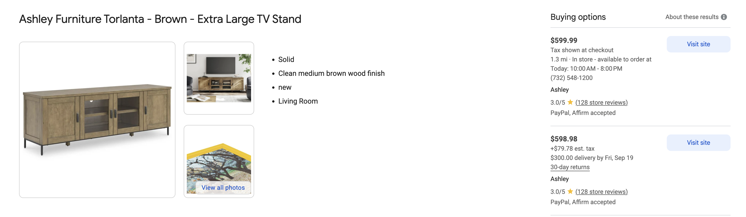 HF | 1 | Living Room | Wooden media console, 6 ft x 3 ft | $599.99 | 0:16 | Ashley Furniture | ![]() |